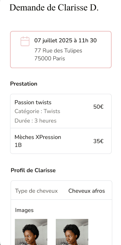 La cliente vous envoie une demande via votre lien Curlink, avec photos et détails de la coiffure souhaitée.