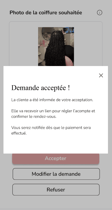 Vous acceptez, modifiez ou refusez la demande (sans justification). La coiffeuse garde toujours le contrôle.